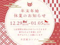 【年末年始のお知らせ】 いつもコトノハをご利用いただきありがとうございます。 年末年始のお知らせです。 12月29日(日)~1月5日(日) 休業1月6日(月) 営業 ご来店お待ちしております。 ご予約は下記の申し込みファームから お知らせ 2024年12月17日